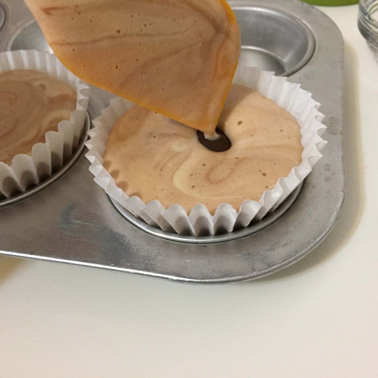 An aromatic chocolate flavour light cupcake with some semi-sweet chocolate found at the bottom. The texture is light, and was supposed to show some swirling patterns. However, over-mixing the batter had blurred some of the patterns :(