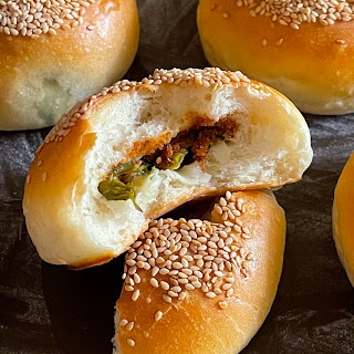 An oriental flavour bun with crunchy roasted sesame seeds topping, and filled with pork/chicken floss, green scallions, coriander leaves, and mozzarella cheese. From these flavourful ingredients, I'm sure you would be able to imagine wonderful taste of these golden buns π